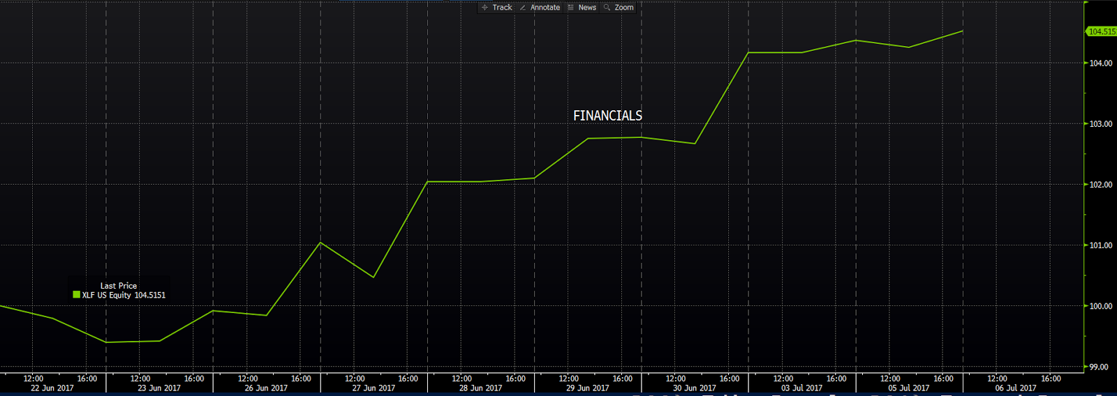 Ah, but if, like us, you’re bullish on financials, you’re feeling pretty good about higher rates amid an improving global economic backdrop. Here’s a 2-week look at our core financials ETF:
