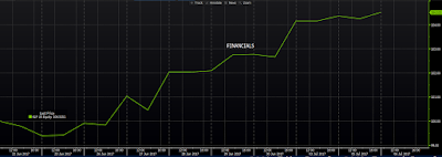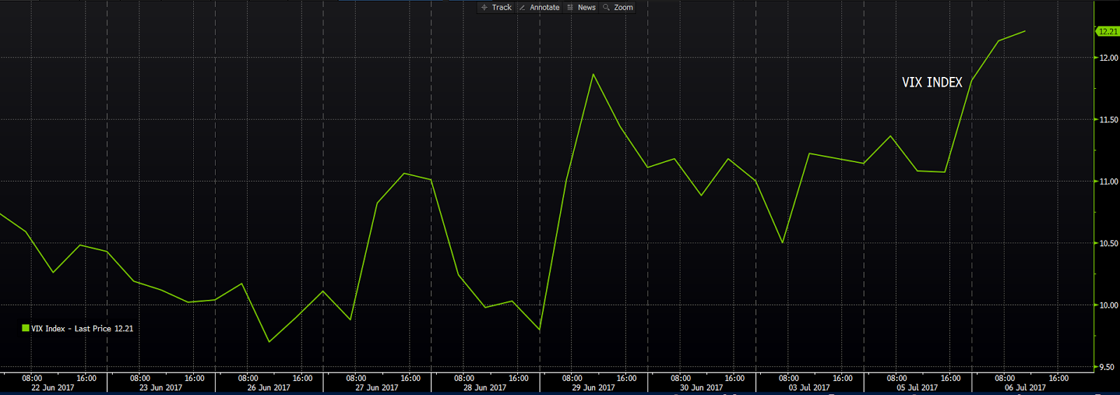 Two things to note in closing: One, 2-week charts are never the makings of long-term investment theses, and, two, after a phenomenal stretch of extremely low rates, we virtually have to expect higher — across the board — volatility, as global asset markets recalibrate to a higher interest rate environment (assuming that’s what shakes out over the coming months). As implied by this 2-week look at the S&P 500 Volatility Index (VIX):