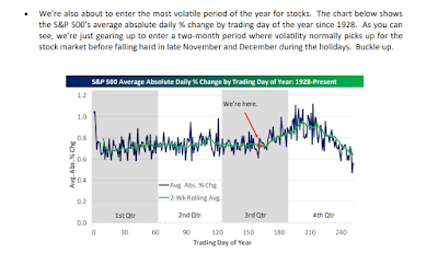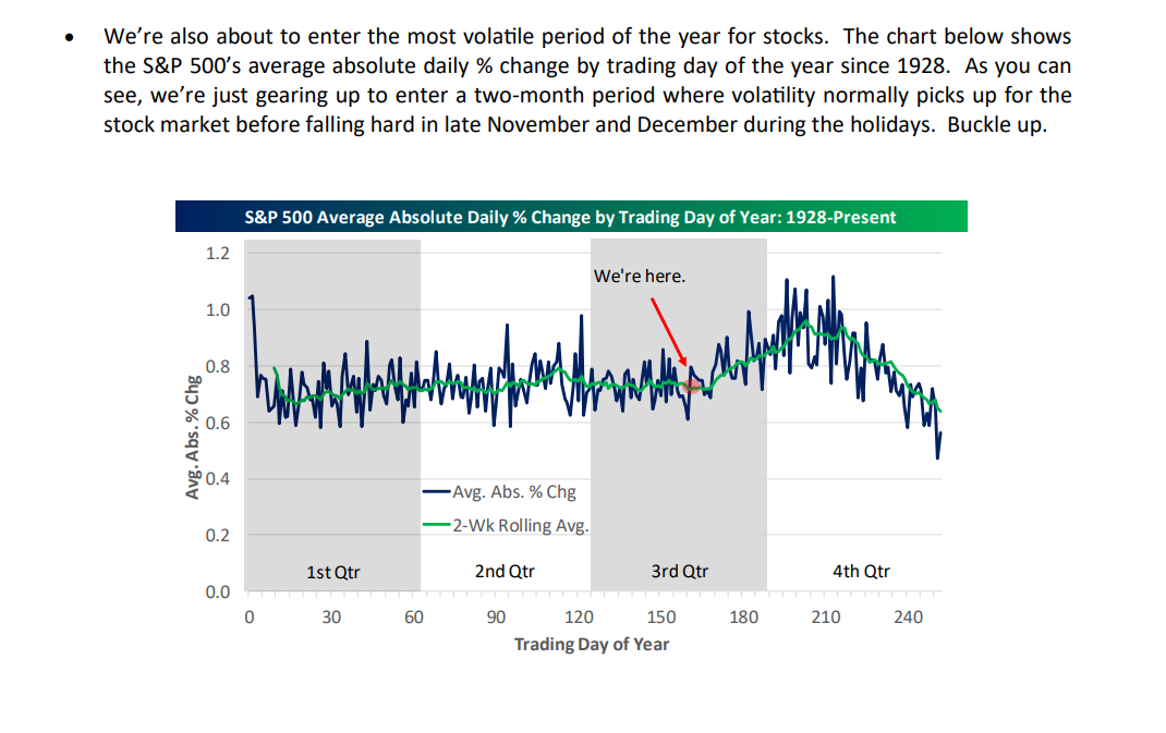 Per Bespoke Investment Group’s chart below, we’re just now entering what has been the most volatile month of the year for stocks, all the way back to 1928. And, trust me, they’re not the only ones aware of it: