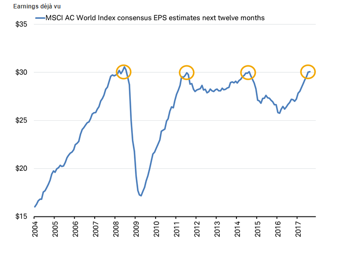 Ever get the feeling that we’ve been here before? For investors, the sense of déjà vu may be coming from corporate earnings. The analyst consensus estimate for earnings per share over the next twelve months for the world’s companies (measured by the MSCI All Country World Index) has risen back to $30 again for the fourth time in 10 years, as you can see in the chart below.