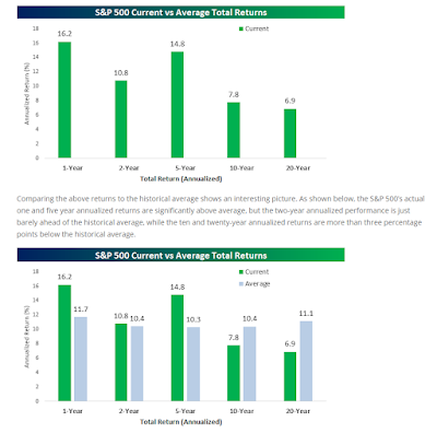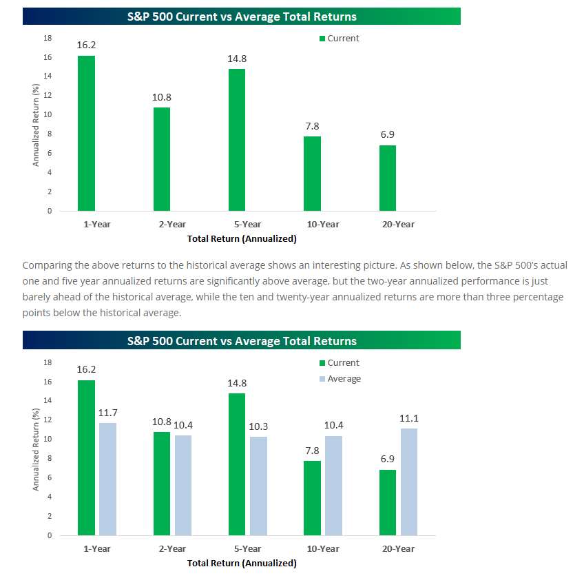 As you’ll see below (courtesy of Bespoke Investment Group), while the (S&P 500) returns on a one and five-year basis have been exceptional, the past 2-year results are nothing special, and we’re not even close relative to past 10 and 20-year average returns: