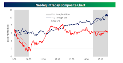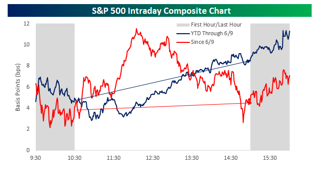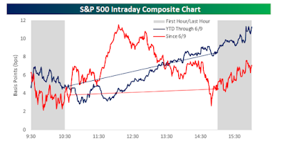 Ironically, Bespoke Investment Group (an important source of data and research for us) happened to be looking at the same stuff. After today’s close they posted the following composite intraday chart for the S&P 500, broken into two time periods: Year-to-date through June 9th (blue line), and post June 9th (red line). Their research shows this late-day bullish action has been prevalent throughout the year.