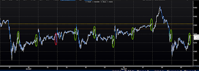 Note: Only one of the last 10 days saw the market sell off markedly into the close. The other 9 late-day rallies suggest that, for the moment, the “smart” money remains bullish.