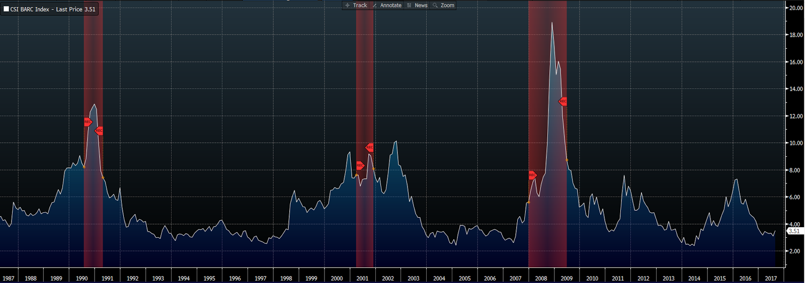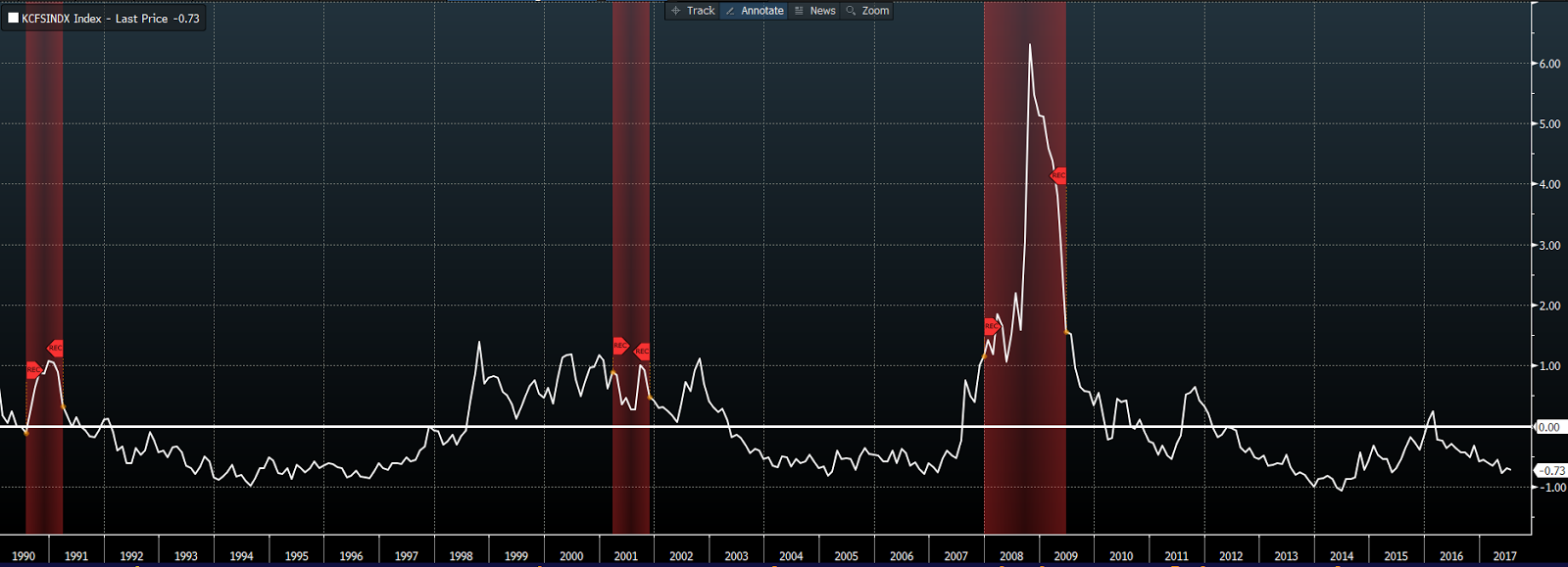 As for economic stress, here are the indicators I showed you last week. Compare present levels to those of past recessions (red shaded areas): Click here for definitions…