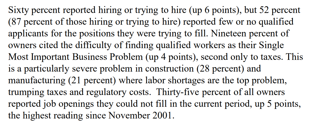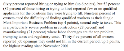 My perusal of last month’s NFIB Small Business Survey inspired this blog post. Being that small business owners employ two-thirds of America’s workforce, we need to take what they say very seriously. And what they say about labor conditions suggests that they’ll be having to raise (inflate) wages going forward if they’re to attract the qualified workers they so sorely need. That’s a higher expense that we should presume will ultimately get passed on to the consumer.