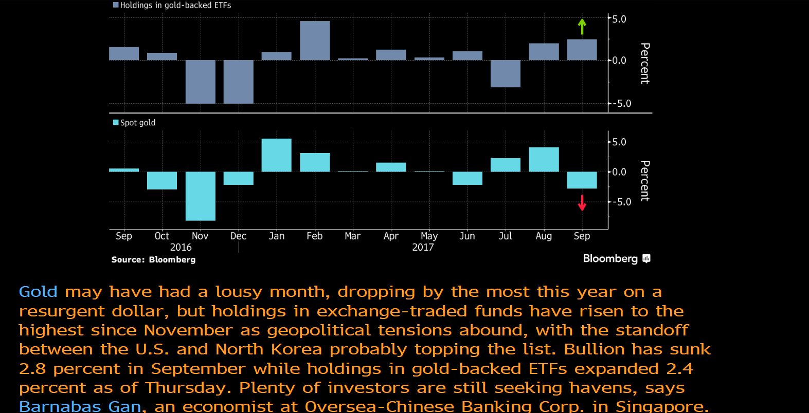 As evidenced by September’s second largest monthly inflow into gold ETF’s this year, just as the price delivered its worst monthly performance since last November: