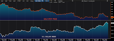 Which is, essentially, a picture of the aforementioned ascent of gold and descent of the dollar.