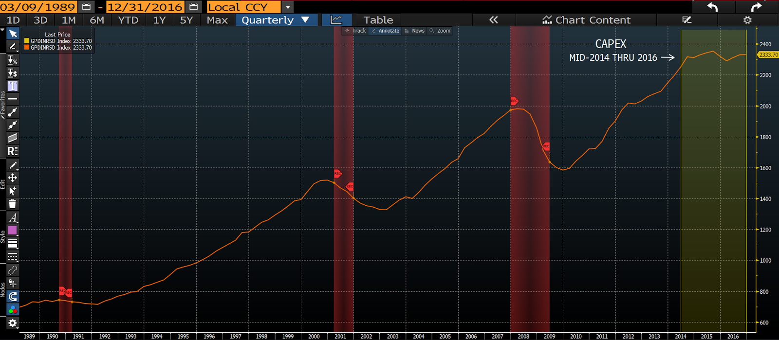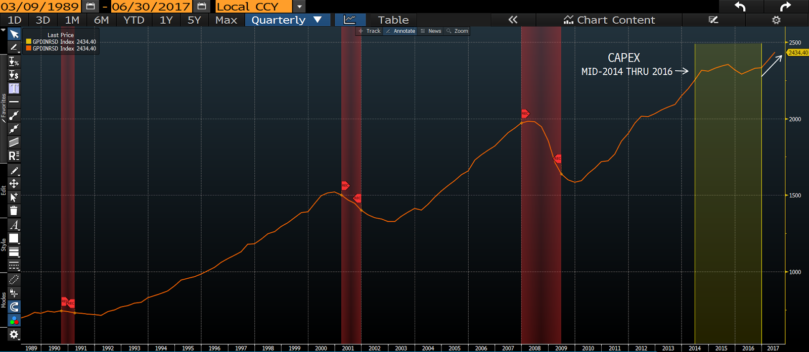 One of our chief complaints/concerns over the past couple of years has been an historic lack of capex  spending (investing on the part of companies in business-expanding capital), relative to past expansions.
