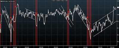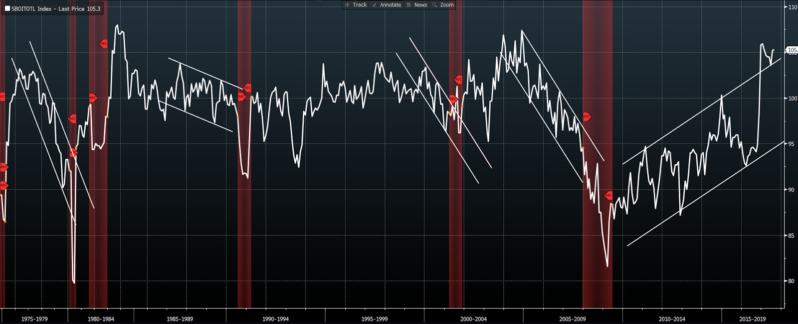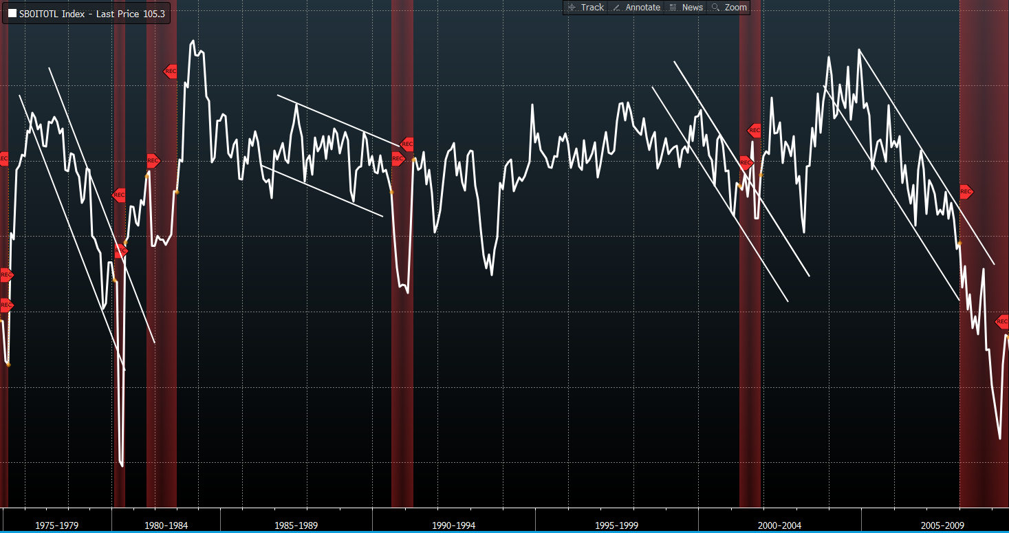 We think the monthly NFIB small business survey is important to pay attention to. Here’s why (optimism reading and past recessions [red shaded areas]): click to enlarge…