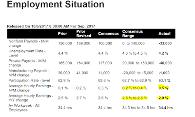 The hurricanes are one factor that may or may not have skewed payrolls sharply lower, and probably did, but it’s the wage pressures that will make everyone on the FOMC, even the most dovish, suddenly concerned that wage-push inflation has arisen from the dead. The Department of Labor hasn’t offered adequate explanations of these results which puts the focus on individual Fedspeak with the chances of a rate hike at the month-end meeting, let alone the December meeting, now likely in play.
