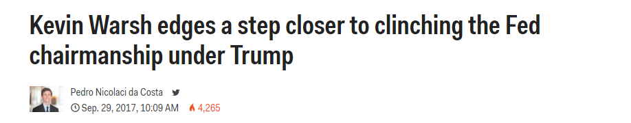 As it turns out, and interestingly (given that he’s considered a frontrunner), Mr. Warsh is reputed to be a monetary policy hawk. Which means he’s ultimately concerned with rising inflation and favors raising interest rates sooner than later. My best guess is that the above headline is, therefore, jumping the gun. While political candidates make great sport of all of the Fed’s economic stimulus during their opponent’s reign, oh how they change their tunes once in office. Show me a sitting politician who desires reelection and I’ll show you someone who wants the Fed to keep rates low and money flowing till the cows come home — or till he or she is ready to leave office — regardless of the long-term risks.