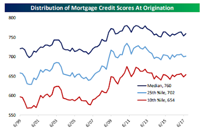 As shown in the chart, mortgage lending standards remain almost brutally high. Even the 10th percentile (i.e., worse than 90% of all loans). Experian describes FICOs of 670 an above as “good”, so that gives you an idea of just how tight mortgage credit has been in recent years; very, very few borrowers with low FICOs (and therefore a lower likelihood of repayment) have been given mortgages since the mid-2000s subprime debacle.