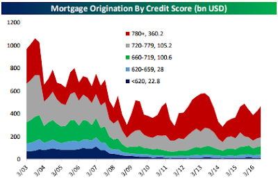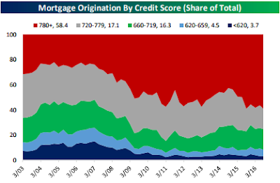To further support that notion, take a look at the latest quarterly Fed assessment of U.S. consumer credit, courtesy of Bespoke Investment Group. I.e., it takes a lot more (a lot more!!) than the ability to fog a mirror (the mid-2000s litmus test) to qualify for a mortgage these days: