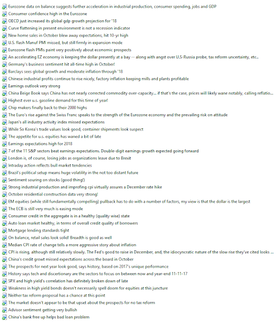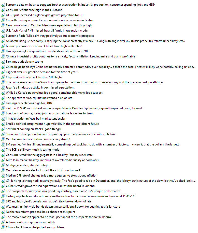 As for this week’s message, we’ll simply offer up the titles of the entries into our November 2017 trends file. Separate from the thorough technical and fundamental analyses we perform at the beginning of each week, we collect and file away additional data that we find instructive in shaping our view of probabilities going forward.