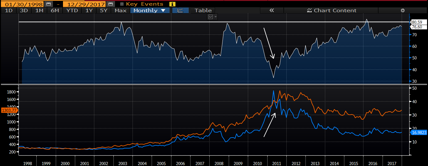 Now, all that said, as sure as I’m sitting here this blog post will find its way onto the computer screen of somebody who has dug much deeper than the simple gold/silver relationship we discussed herein. They will, for example, justifiably slam me for not citing the reported huge mismatch between the demand for silver versus its supply in 2011, which of course, they’ll exclaim, resulted in its rapid run higher. The problem is, they won’t be able to explain what happened as silver crashed back to earth amid the essentially same fundamental supply/demand backdrop. Actually, they will, but their explanations will come wrapped in fascinating conspiracy theories involving manipulation by the banking system. Regardless of whether or not their claims carry water, you and I have to live in the real world, and, for the moment, real world intermarket relationships say that a bullish scenario for silver needs a bullish scenario for gold. And, recent rally — and geopolitical/fed policy hiccups — notwithstanding, we don’t see an investible scenario for silver (relative to other alternatives) as we head into 2018.