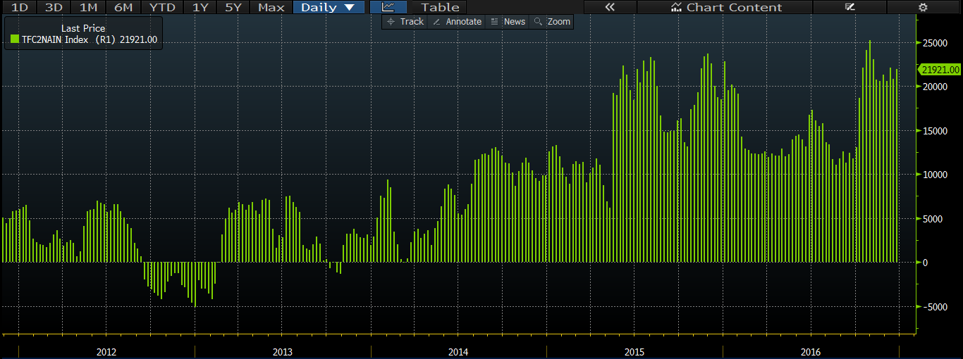 Here’s a 5-year chart (ending 12/31/16) of the net positioning among asset managers who trade futures contracts on the U.S. dollar index: click any chart below to enlarge