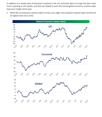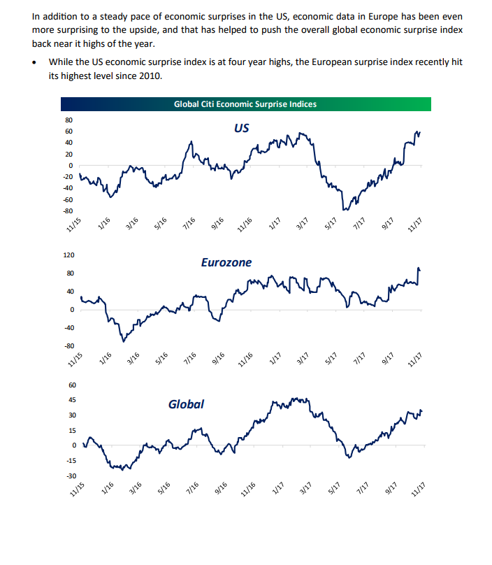 We’ve been expressing herein often of late (here and here for example) our view that the global economic setup looks quite good. The below (again from Bespoke) suggests that it’s even better than economists expected: click to enlarge