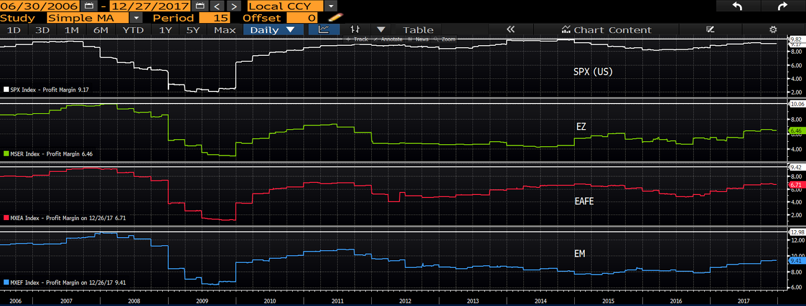 In terms of profit margins globally; the U.S. is still flirting with record margins, as the rest of the world, while now seeing margin growth, still has a ways to go: