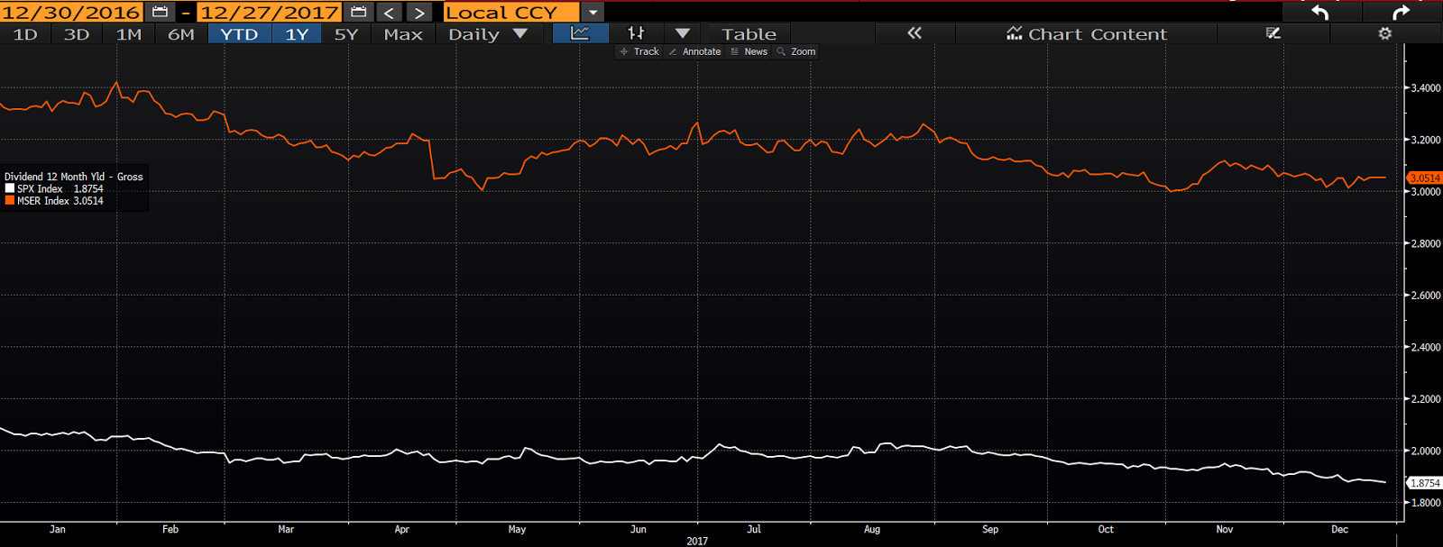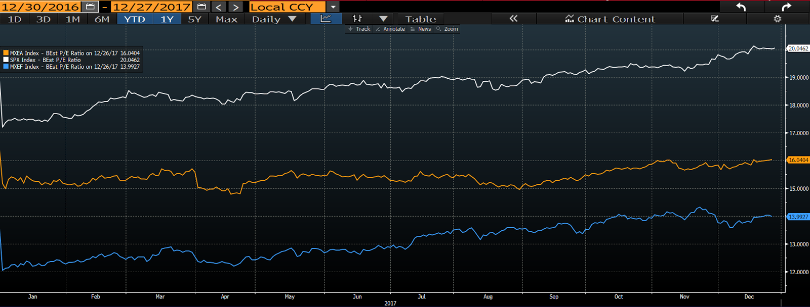 Here’s a look at the performance of the U.S. S&P 500 Index (white line), developed non-US markets (yellow) and emerging markets (blue) in 2017. As you can see, after a long period of under-performance, non U.S. equities were, in the aggregate, the best places to be this year: