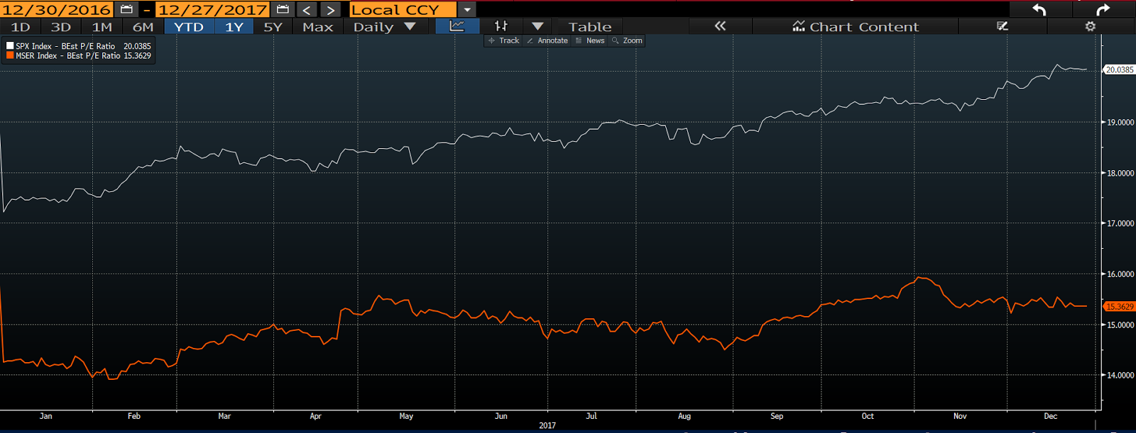 In terms of valuations, non-US markets remain notably cheaper (from a price to earnings standpoint) than the U.S.: