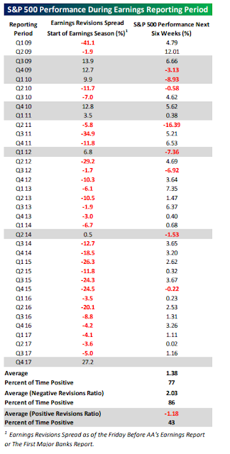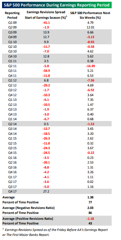 In other words, when the revisions spread was negative, stocks made earnings season gains 86% of the time. When it was positive, as it is now, stocks gained only 43% of the time!