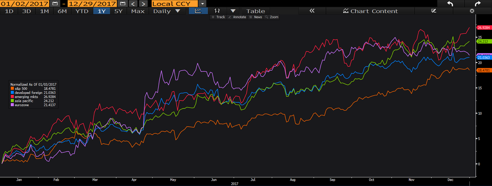 Here’s the chart where we track performance for the U.S., the Asia Pacific region and the Euro Zone, along with developed non-U.S. markets and emerging markets in their respective aggregates: