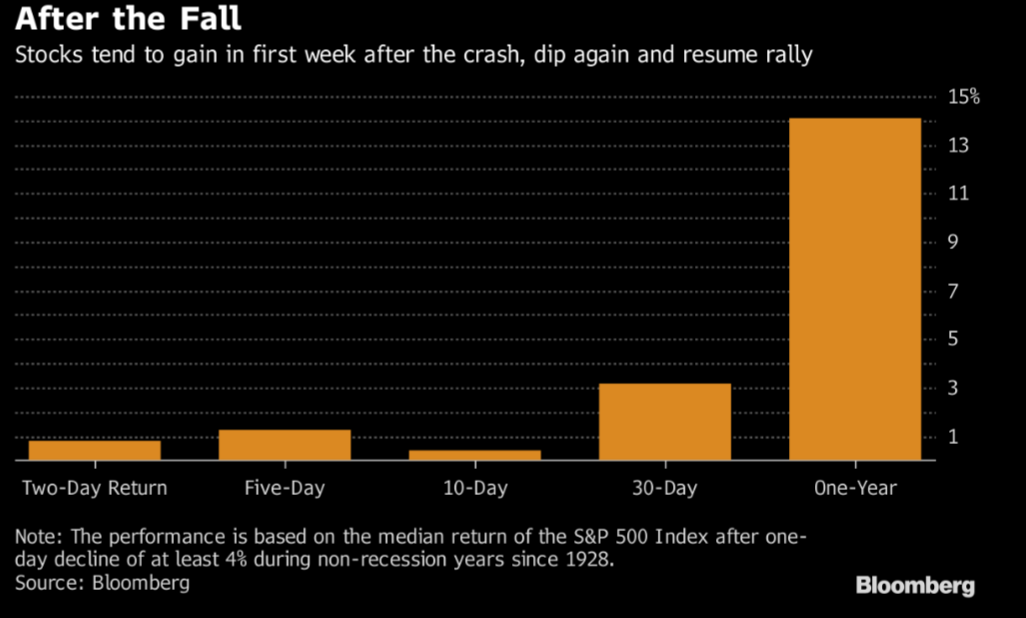 Following Monday’s market crash that saw the S&P 500 Index decline by over 4 percent, investors worldwide are wondering what will come next. Bloomberg’s analysis of the benchmark’s median price return after a one-day decline of at least 4 percent during non-recession years since 1928 suggests some consolidation may occur over the next week before the equity rally resumes, ultimately returning around 14 percent in the next 12 months. The one wildcard that still remains — how all the volatility and quant strategies behave in the next few days.