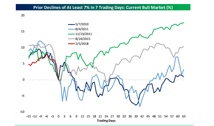 While the volatility of the past week feels so foreign, Bespoke points out that there have been four prior instances where the S&P fell at least 7% in a 7 trading day span during the current bull market.