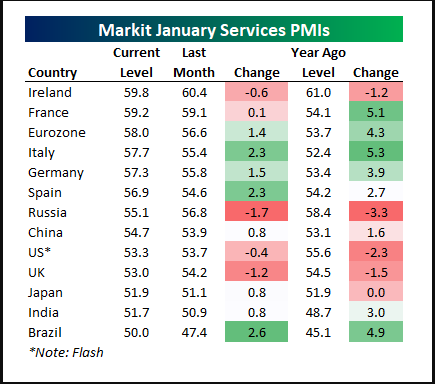 Well, the recent dip in stocks has nothing to do with the strength of the global economy. Here are the freshly released service sector Purchasing Manager Indices for 13 major economies. 50 and above denotes economic expansion:
