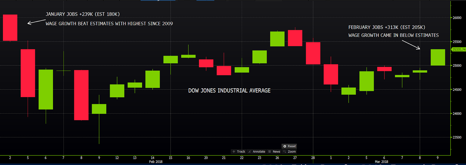 Our suggestion lies partly in the fact that when January’s healthy jobs report featured a surprise pickup in wages (exceeded estimates, while February’s missed) — presumed inflationary — the market tanked (Dow -667):