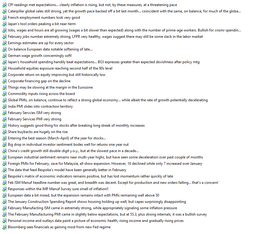 In addition to the 81 inputs to our proprietary macro index, we maintain a monthly file where we capture other data that helps instruct our view of present global conditions. The following titles from our to-date March current trends file — while pointing to some softening in the rate of growth in the Eurozone (supporting our stronger dollar thesis going forward) — suggest that on balance the picture is one of sustainable global growth for the time being: