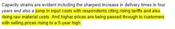 - The already enacted steel and aluminum tariffs are reportedly showing up in input costs (read higher prices/lower profits and/or eventually lower sales).