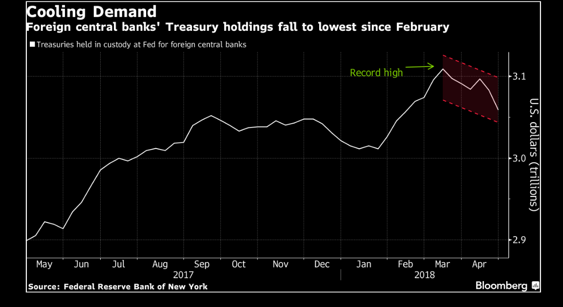 Central banks may be losing their appetite for Treasuries just as supply is set to ramp up. The amount of U.S. government bills, notes and bonds held in custody at the Federal Reserve Bank of New York fell to $3.06 trillion as of April 25, down from a record high of $3.11 trillion reached in March, data released Thursday show. The decline suggests that “some foreign official institutions may be reducing Treasury holdings in response to global trade tensions,” Amherst Pierpont Securities global strategist Robert Sinche wrote in a note Friday.