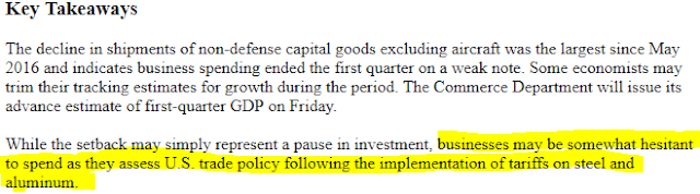 • The already enacted steel and aluminum tariffs are reportedly showing up in input costs (read higher prices/lower profits and/or eventually lower sales).