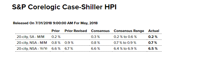 Home prices in New York City fell 0.3 percent in the month with Detroit down 0.2 percent. Washington DC was unchanged with Chicago up only 0.1 percent. At the opposite end, Seattle continues its 1 percent monthly clips, rising 1.4 percent in May. Phoenix has also been very strong, up 0.8 percent in the month with San Francisco up 0.5 percent.