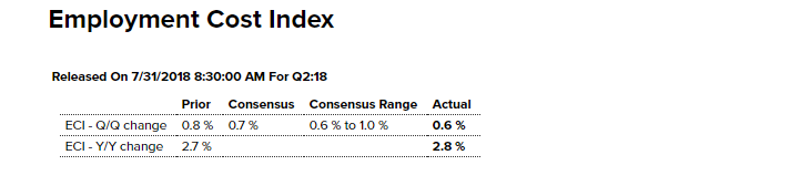 Wages & salaries rose only 0.5 percent in the quarter, well down from 0.9 percent in the first quarter in what will be a relief for Federal Reserve policy makers who are on the watch for wage pressures given the strength of the labor market. But there is cost pressure for employers and that’s in benefits which had been behaved but did rise 0.9 percent in the latest quarter.