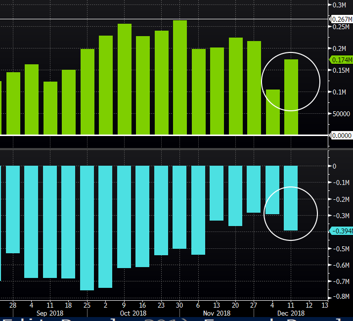 The chart below suggests that futures speculators have grown more bullish on stocks (top panel), and bearish on treasuries (bottom panel) of late; supporting other technical evidence that maybe (i.e., absolutely no guarantees!) the current correction is nearing its bottom: