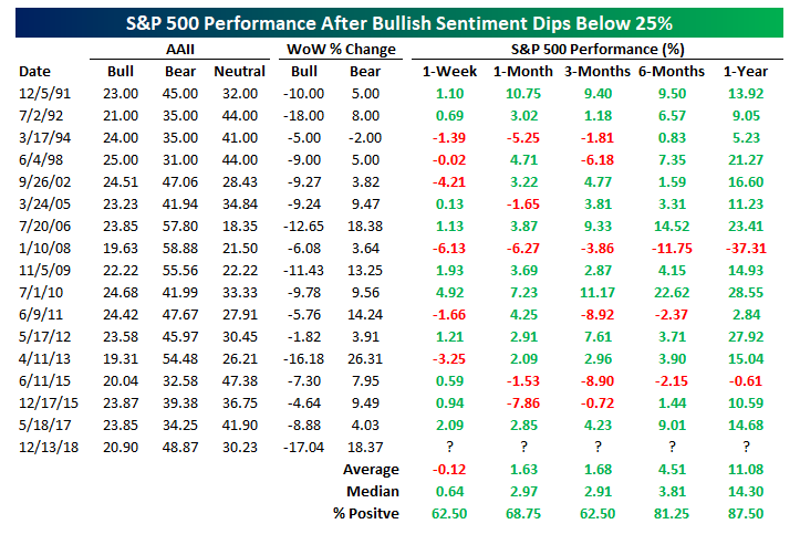 In the table below, we show every time the AAII bullish sentiment has dropped below 25% after not having done so for six months. Historically, the performance of the S&P 500 following these low readings in sentiment has generally been positive with outperformance on the part of the S&P 500 versus its performance following all other AAII releases. While the average one week return is slightly negative, every other average and median return for all the time periods shown is positive. Six months later, for example, the S&P 500 was up an average of 4.51% with positive returns over 80% of the time. One year later, the S&P 500 saw double-digit percentage average and median returns with gains nearly 90% of the time.