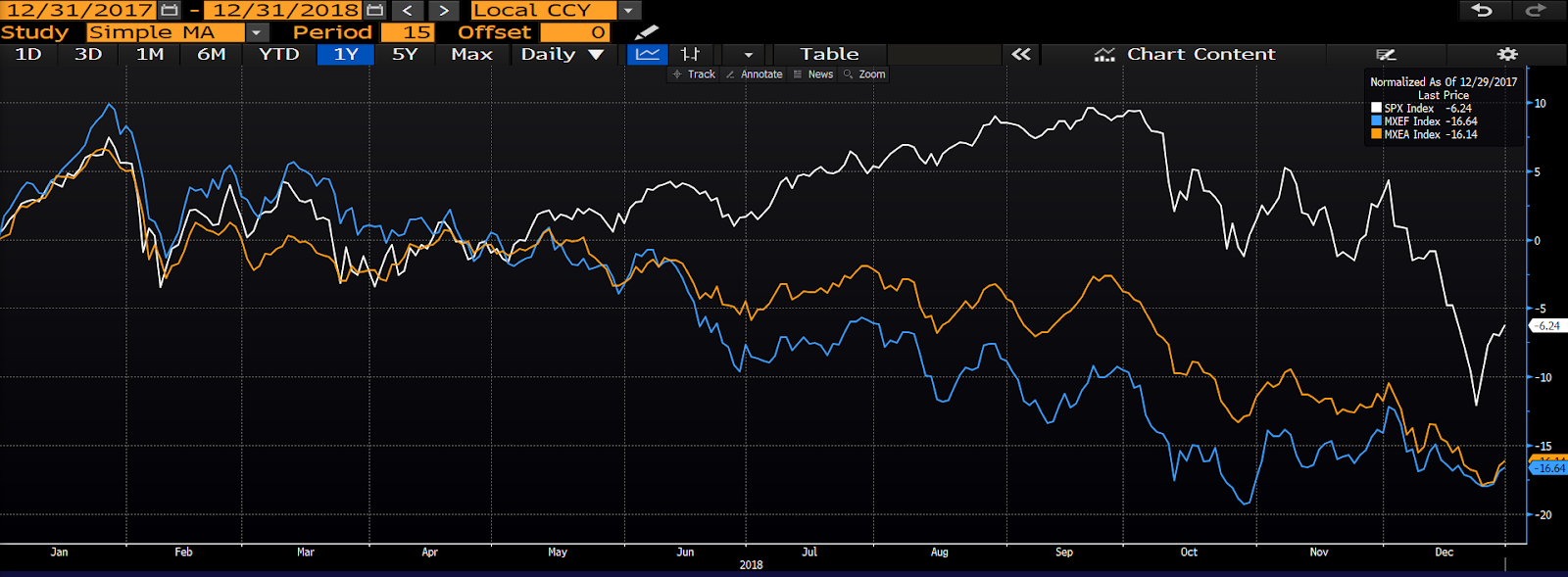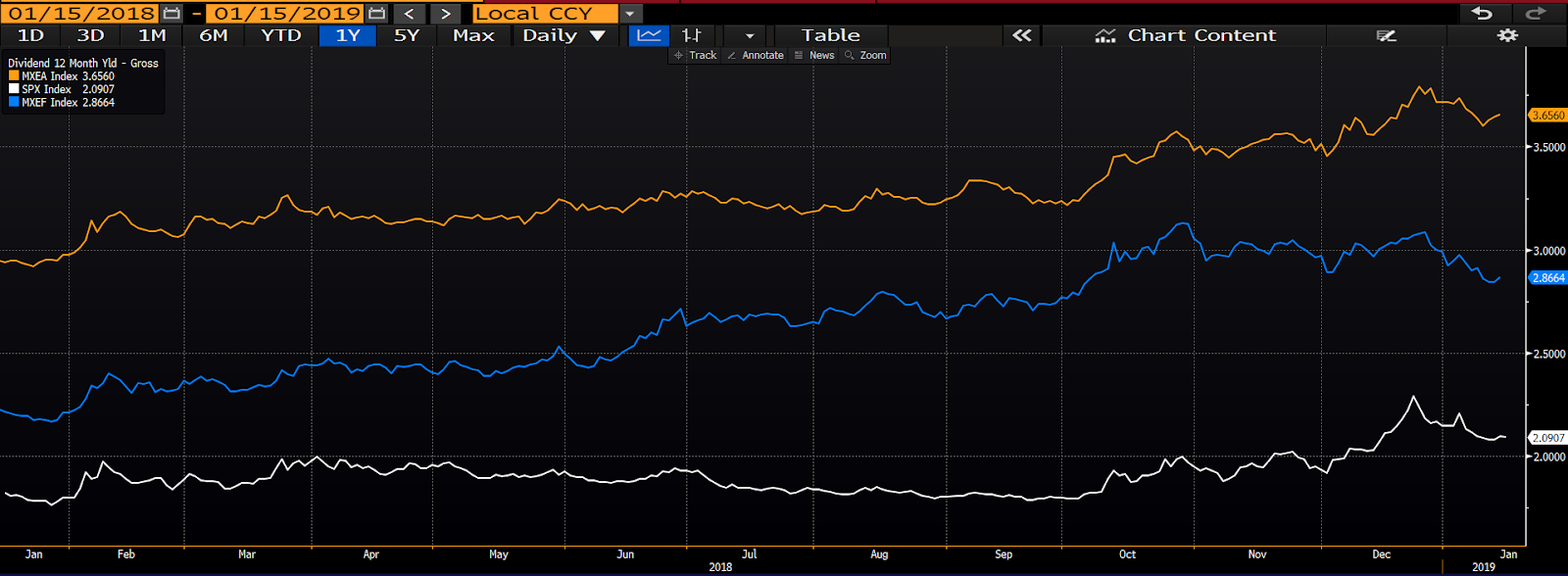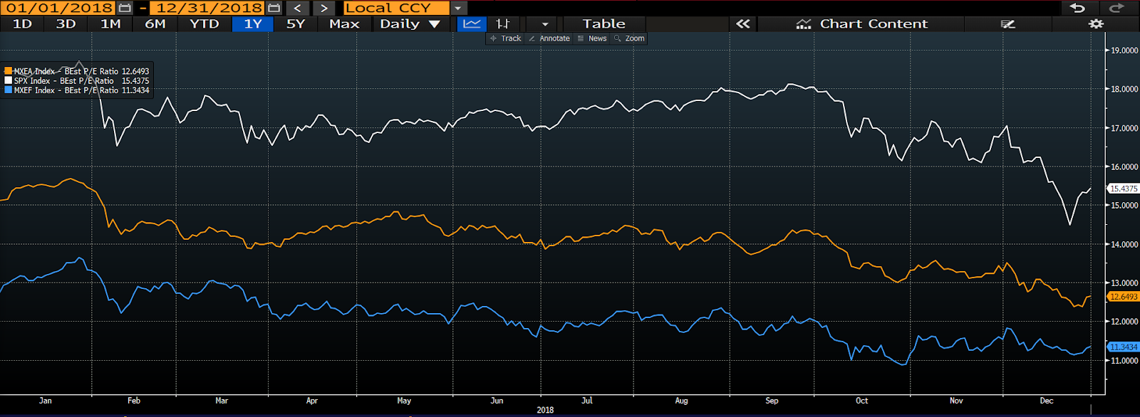 Here’s a look at the performance of the U.S. S&P 500 Index (white line), developed non-US markets (yellow) and emerging markets (blue) in 2018. As you can see, after strong out-performance in 2017, non U.S. equities were a tough place to invest last year; creating historically attractive relative valuations: