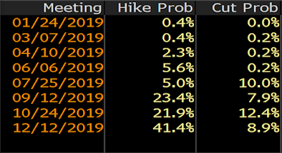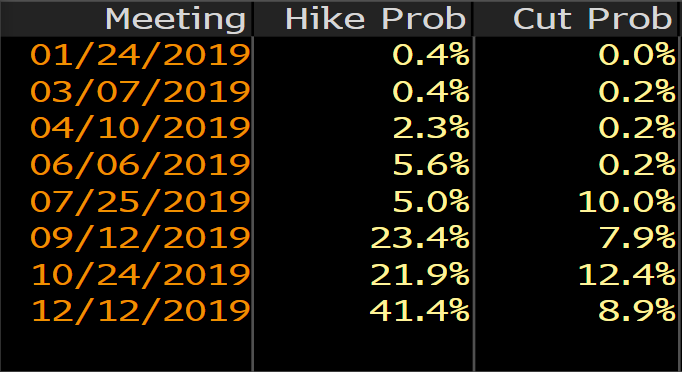 As for central bank policies, at the start of last year futures traders were pricing in a 44% chance of a rate hike by October of this year by the European Central Bank. As you can see below those odds have been sliced by more than half; although odds are back above 40% for December: