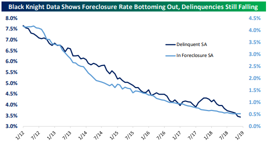 In a weekend blog post I illustrated the market’s view of the present state of U.S. housing (bullish). Keeping with that theme — by way of foreclosure and mortgage delinquency rates — here’s more evidence from this telling sector that the U.S. consumer-driven economy, not to mention the financial condition of the U.S. consumer him/herself, remains in pretty decent shape: