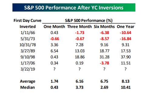 Bespoke Investment Group, in their weekend commentary, addressed the historical implications for stock market returns immediately following yield curve inversions.