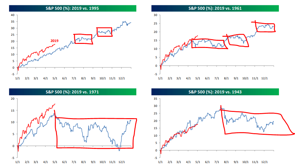 In Bespoke Investment Group’s weekly analysis (premium content), they show the rest-of-year results for the years that have historically correlated the strongest with 2019 (from 1/1 to 5/3). I added the red rectangles: click to enlarge…