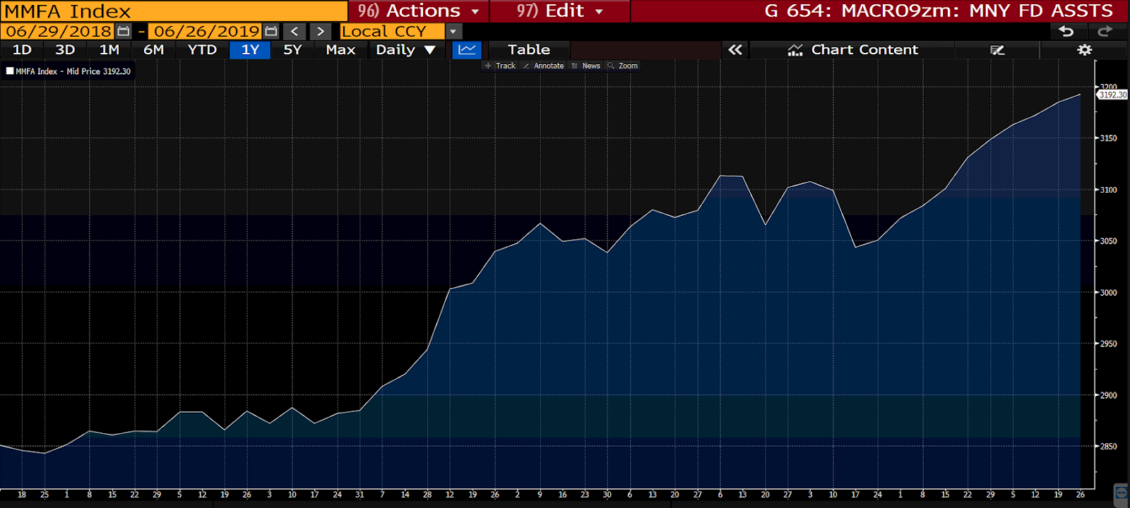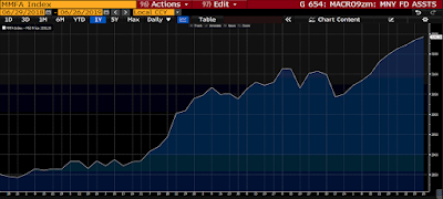 That said, despite the market’s record high level, individual investor sentiment came in surprisingly below average last week: That denotes skepticism and, thus, cash on the sidelines. In fact, looking at our latest money market fund assets chart (next chart below), there is indeed a lot of cash that can come rushing into stocks right here, if it so desires: