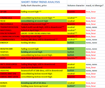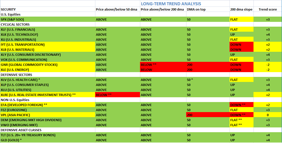 I suspect the market will respond positively when futures trading resumes this evening. Were it not for that news, however, I believe there would’ve been follow-through selling after Friday’s notable intraday reversal (there may still be regardless) – as the daily trend shifted late last week from strong buying at the close (a bullish sign), to strong selling (bearish). Plus, my weekly technical analysis paints quite the negative short-term picture for the cyclical sectors, as well as the major averages here and abroad, while looking more constructive with regard to the defensive sectors, bonds and gold: click any insert below to enlarge…