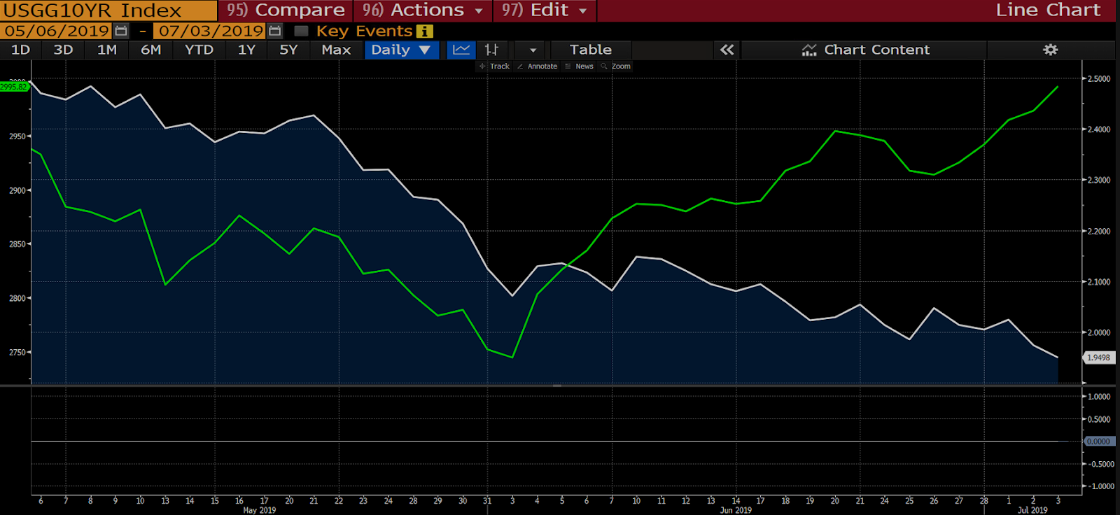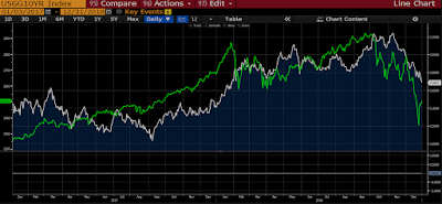 For context, here’s the 10-year yield (white) on a chart with the S&P 500 (green) from 1/1/2017 through last year: