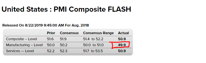 In case you’re wondering what happened to this morning’s strong rally; at 6:45 am (pdt), exactly when stocks began selling off, Markit’s U.S. Manufacturing Purchasing Managers Flash (advanced [i.e., 85% complete]) Index for August was released.