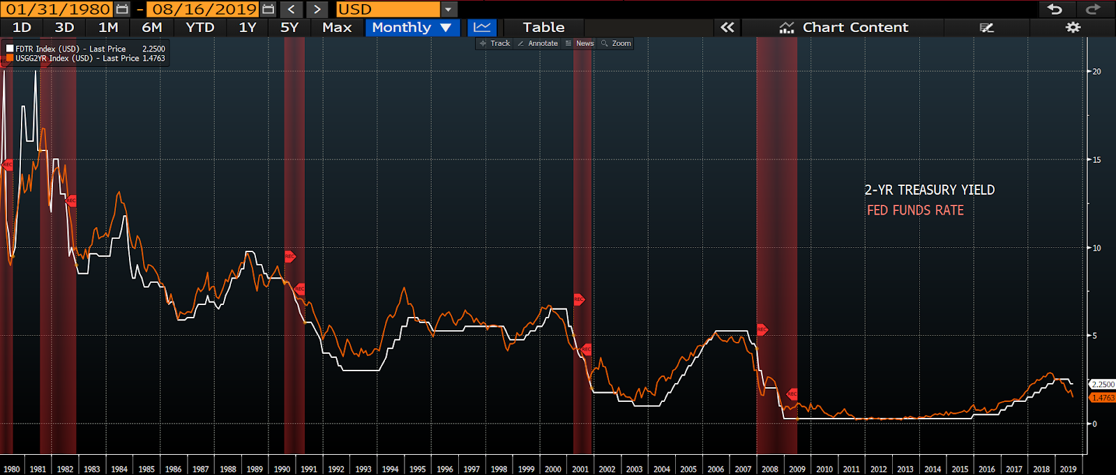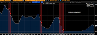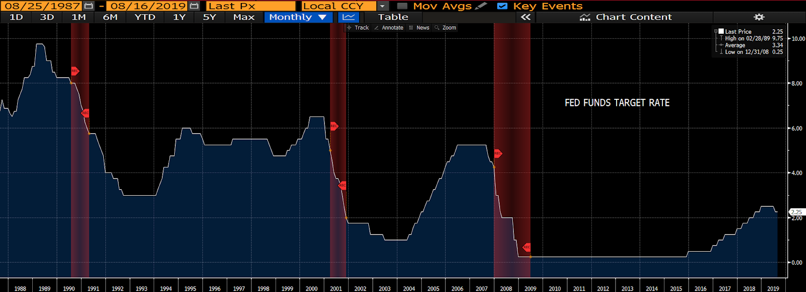 Here’s the Fed Funds target rate. Note all the times it’s dropped (when the Fed cut it) over the past 20+ years. Remember, the red shaded areas are past recessions: