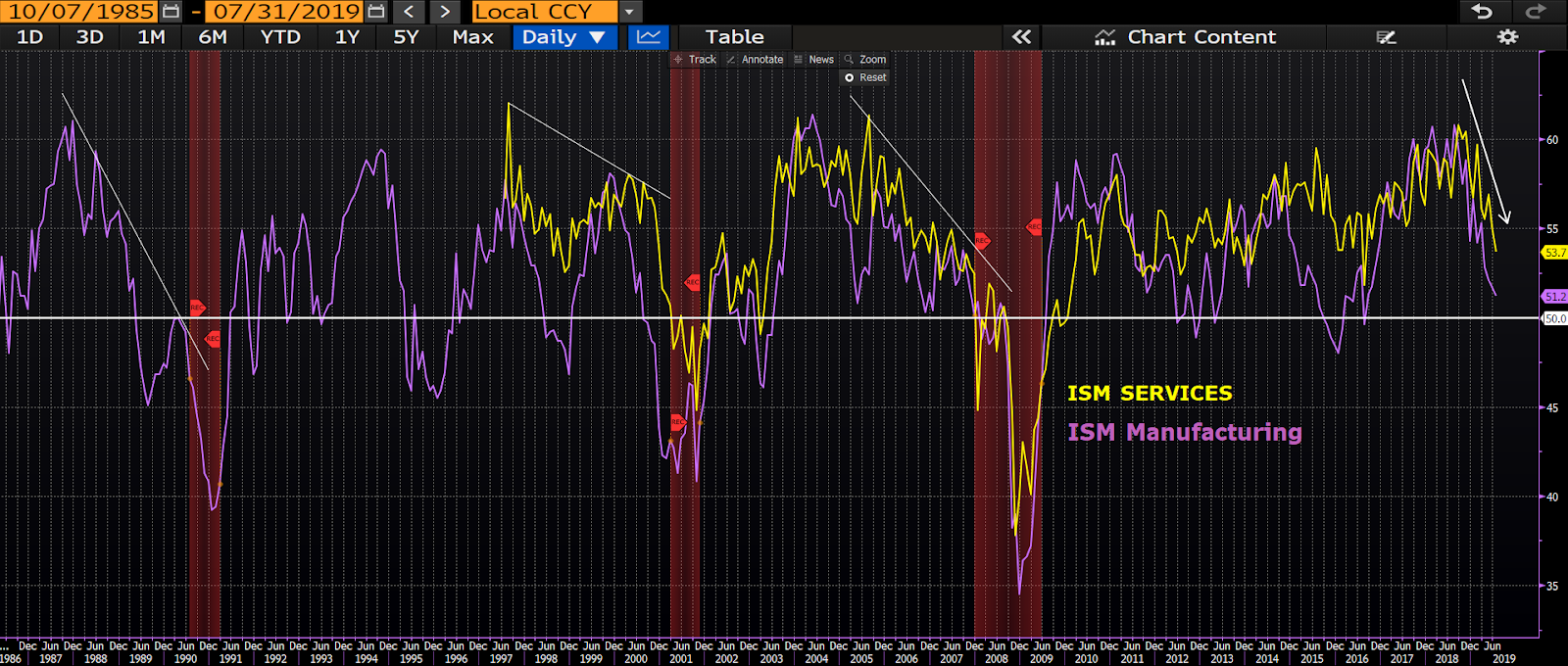 Here are a few of the key macro indicators that are presently weighing on our index. Note how they tend to trend leading into recession; you’ll see why we don’t share Kudlow and Navarro’s confidence on the present state of general conditions.
