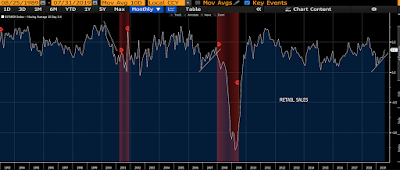 Kudlow’s right, they are definitely trending up. But, boy, the trend looks eerily like the one that economists chased right into the Great Recession of 2008 (large red shaded area). Imagine how shocked one would be — if all he/she was tracking was retail sales — when the big one hit! Especially after tracking how sales were tanking heading into the early-2000s recession.